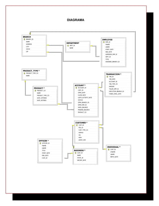 Este documento presenta los ejercicios de SQL obligatorios y opcionales para una asignatura sobre bases de datos. Incluye 25 consultas SQL con instrucciones como SELECT, COUNT, WHERE y UNION para recuperar y manipular datos de diferentes tablas como CUSTOMER, ACCOUNT, EMPLOYEE y más. También contiene una sección sobre las tablas utilizadas y otra sobre cómo insertar datos en algunas de las tablas.