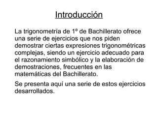 Este documento presenta una estrategia para demostrar igualdades trigonométricas complejas mediante el desarrollo de expresiones y la simplificación de términos. Incluye cinco ejemplos resueltos que ilustran esta estrategia, desarrollando expresiones que contienen sumas, restas y ángulos dobles y simplificando los términos resultantes.