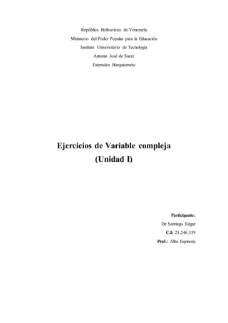 Este documento presenta ejercicios sobre variables complejas para un estudiante. Incluye cuatro problemas resueltos: 1) realizar operaciones con números complejos, 2) describir el lugar geométrico definido por una ecuación, 3) demostrar una identidad trigonométrica, y 4) expresar una función en forma de parte real e imaginaria.