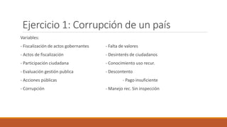 Este documento presenta 5 ejercicios de diagramas causales con variables asociadas a diferentes temas como corrupción, fabricación de bicicletas, normas de calidad, ventas de zapatos y número de habitantes. Para cada ejercicio se propone desarrollar un diagrama causal utilizando el método Forrester para mostrar las relaciones de causa y efecto entre las variables listadas.
