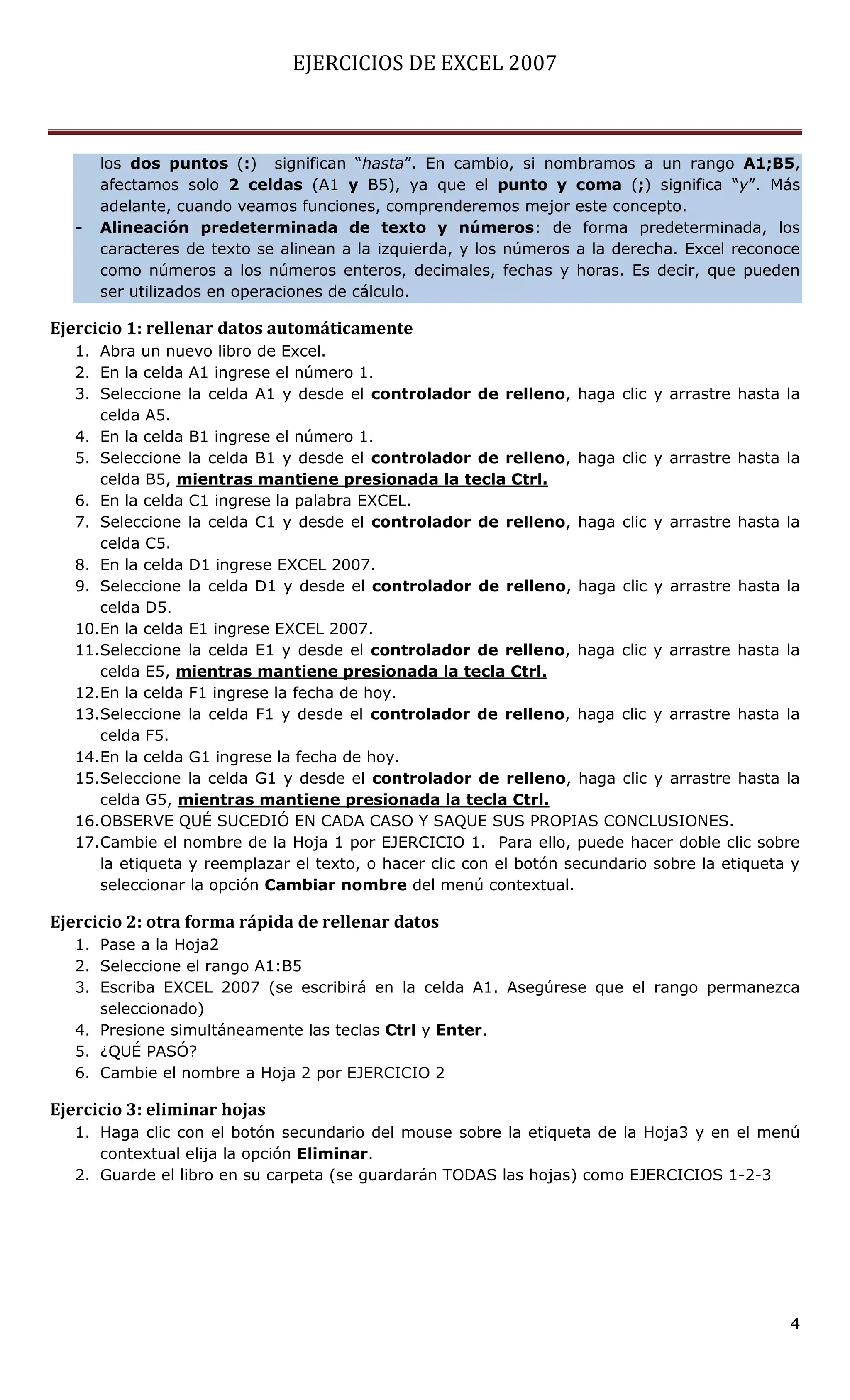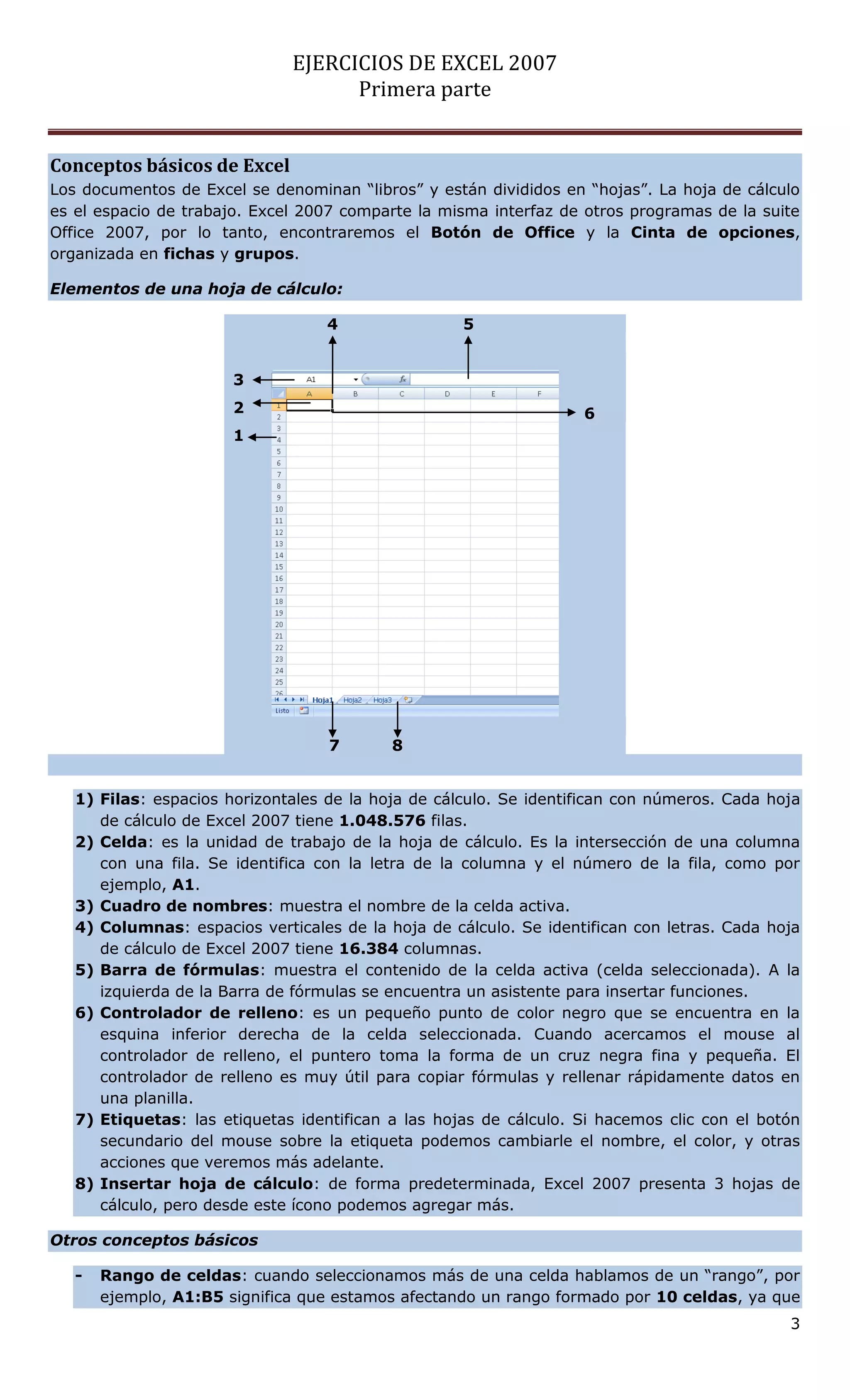 Este documento presenta conceptos básicos de Excel y tres ejercicios prácticos. Explica que una hoja de cálculo de Excel se compone de filas y columnas que forman celdas, y describe elementos como el cuadro de nombres, la barra de fórmulas y el controlador de relleno. Los tres ejercicios muestran cómo rellenar celdas automáticamente usando el controlador de relleno y la tecla Ctrl, cambiar el nombre de las hojas, y eliminar una hoja.