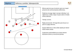 Este documento presenta varios ejercicios y objetivos tácticos para un equipo de fútbol. Incluye instrucciones para la defensa y el cambio de orientación, la estrategia ofensiva, los ataques por las bandas y los cambios de orientación, el repliegue y las salidas de contrataque, la velocidad en las coberturas defensivas, y una tarea grupal para mejorar los desdoblamientos. Los ejercicios se enfocan en movimientos tácticos, posicionamiento, progresión del balón, y finaliz