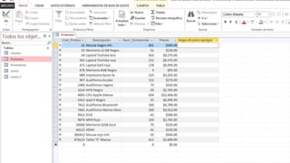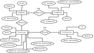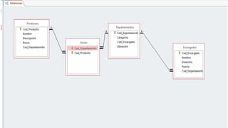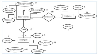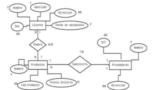 El documento describe una empresa que vende productos a clientes. Los datos de los clientes incluyen nombre, DNI, dirección y fecha de nacimiento. Los productos tienen nombre, código y precio. Los clientes pueden comprar varios productos y un producto puede ser comprado por varios clientes. Los productos son suministrados por proveedores, donde cada producto solo puede ser suministrado por un proveedor.