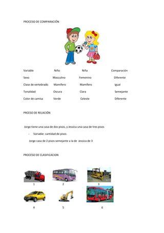 El documento describe varios procesos de pensamiento como observación, descripción, comparación, relación, clasificación, características esenciales, definición de conceptos, cambio, secuencia, ordenamiento y transformación. Se proporcionan ejemplos detallados de cada proceso con variables, características y pasos específicos.