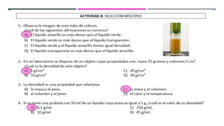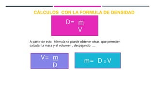 El documento explica los conceptos de densidad, masa y volumen, y cómo se relacionan a través de la fórmula de densidad. Presenta ejemplos de cálculos utilizando la fórmula para determinar la densidad, masa o volumen de un objeto cuando se conocen dos de las tres propiedades. También incluye ejercicios para que el estudiante practique estos cálculos.