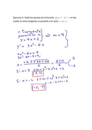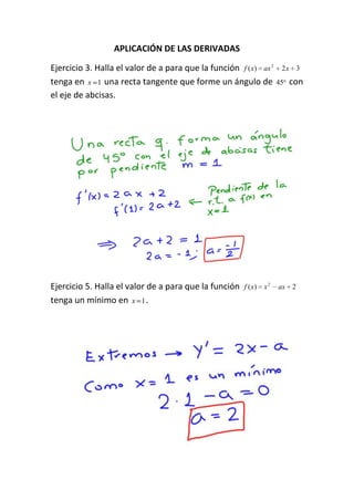 Este documento presenta 8 ejercicios sobre el cálculo de derivadas para funciones específicas. También presenta 2 problemas de optimización que involucran determinar valores para maximizar o minimizar áreas o volúmenes.