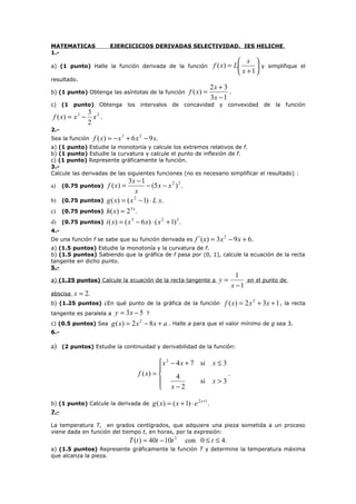 1. El documento presenta una serie de ejercicios sobre derivadas que incluyen calcular derivadas de funciones, estudiar monotonicidad, extremos relativos, puntos de inflexión, asíntotas y representar funciones gráficamente.