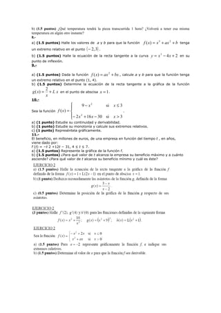 2. También incluye calcular ecuaciones de rectas tangentes a funciones en puntos dados y determinar valores para que funciones tengan ciertas propiedades.