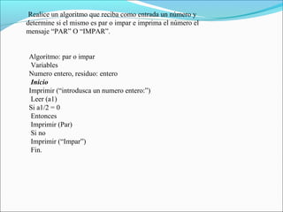 El documento presenta dos algoritmos. El primero determina si un número ingresado es par o impar. El segundo calcula el aumento salarial para trabajadores universitarios según su tiempo de servicio, el cual puede ser de 1-5 años (aumento del 3%), 5-10 años (5%), 10-20 años (8%) o 20+ años (12%).