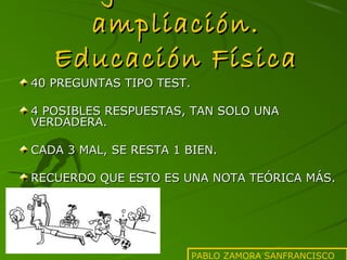 Este documento presenta 40 preguntas de tipo test sobre diversos temas relacionados con la educación física como el calentamiento, acrosport, baloncesto, balonmano, escalada y alpinismo. Las preguntas tienen 4 opciones de respuesta y solo una es correcta, perdiéndose un punto por cada 3 respuestas erróneas.