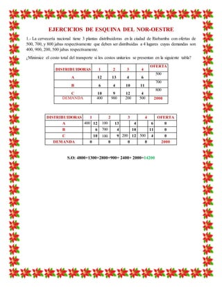 Este documento presenta dos ejercicios que involucran el método de asignación húngaro. El primero asigna cuatro vicepresidentes a inspeccionar cuatro plantas teniendo en cuenta su experiencia. El segundo asigna tres equipos de mantenimiento a realizar mantenimiento en tres máquinas. Ambos ejercicios utilizan matrices de asignación y reducción para encontrar la asignación óptima que minimice los costos totales.