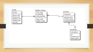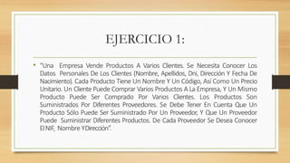 El documento presenta 6 ejercicios de entidad-relación. Cada ejercicio describe un escenario de negocio e indica los datos relevantes de las entidades y relaciones que deben modelarse en la base de datos correspondiente. Se pide diseñar la solución de entidad-relación para cada uno de los 6 escenarios planteados.