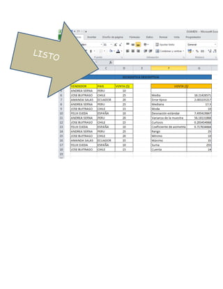 Este documento presenta tres ejercicios de estadística. El primero instruye cómo completar un cuadro de distribución de frecuencias calculando la frecuencia absoluta, relativa y relativa acumulada. El segundo ejercicio instruye cómo completar un cuadro de estadísticas descriptivas habilitando la opción de análisis de datos. El tercer ejercicio guía cómo crear un histograma de una serie de datos ingresando rangos, clases y porcentaje acumulado.