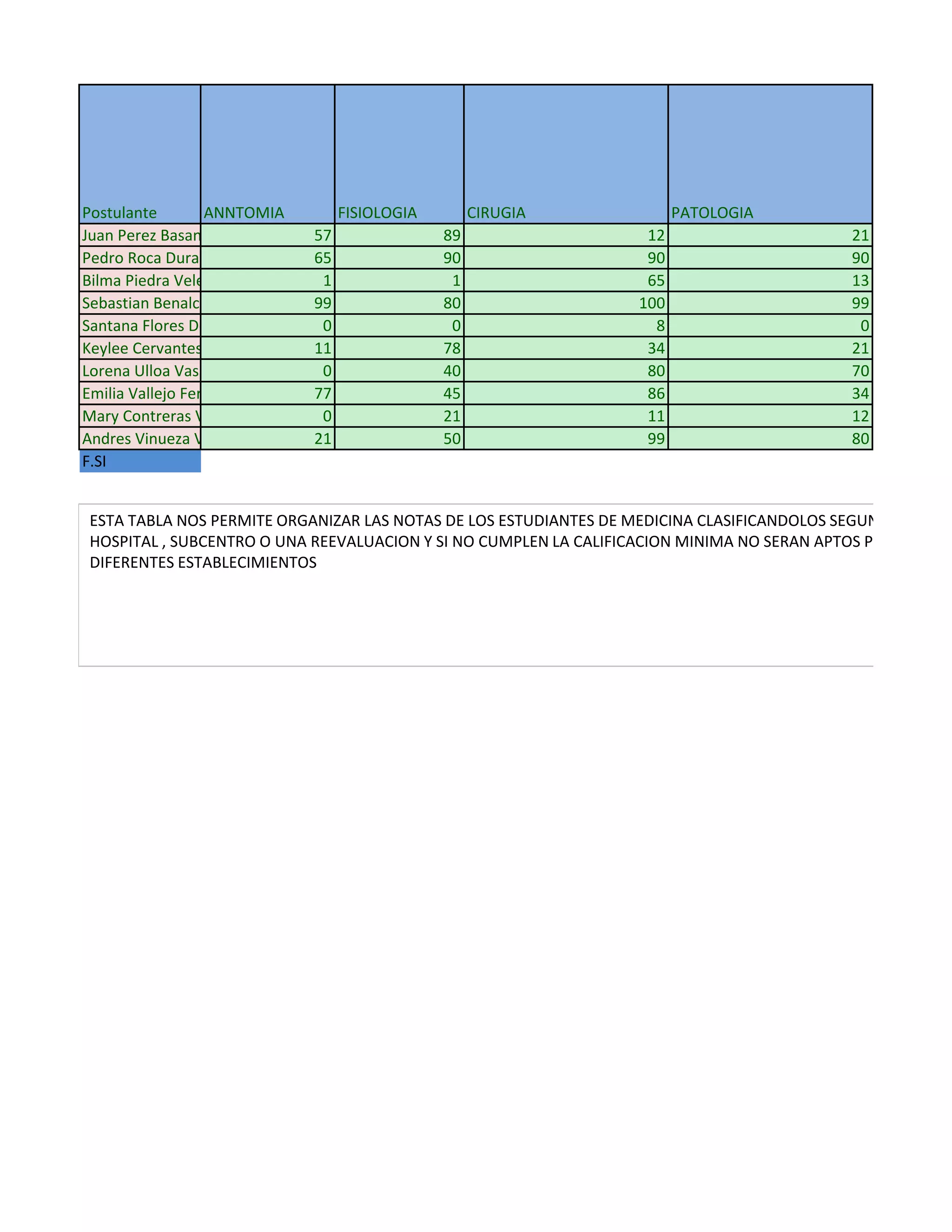 Este documento presenta las notas de 10 estudiantes de medicina en las asignaturas de Fisiología, Cirugía, Patología y su promedio total, clasificándolos según su estado de aptitud para ingresar al hospital, ser enviados a un subcentro o requerir una reevaluación.