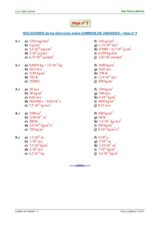 Este documento presenta una serie de ejercicios sobre conversiones de unidades en física y química. Proporciona cinco secciones con múltiples problemas que involucran convertir entre unidades como gramos, centímetros, kilómetros por hora, grados Celsius y notación científica. También incluye una sección de soluciones con las respuestas a los ejercicios de conversión de unidades.