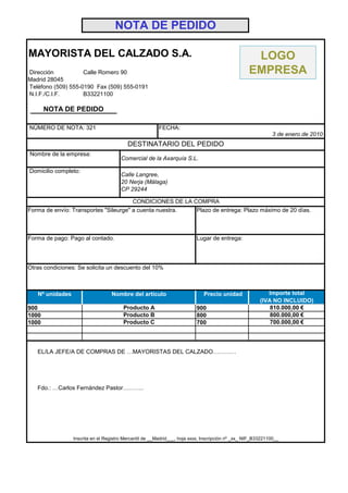 El documento contiene información sobre una nota de pedido realizada por la empresa Mayoristas del Calzado a la empresa Comercial de la Axarquía por 900 unidades de Producto A, 1000 unidades de Producto B y 1000 unidades de Producto C. Posteriormente, se muestra la nota de transporte de la mercancía de Mayoristas del Calzado a Comercial de la Axarquía a través de Transportes Rerápido y el albarán de entrega de la mercancía el 7 de enero de 2010.