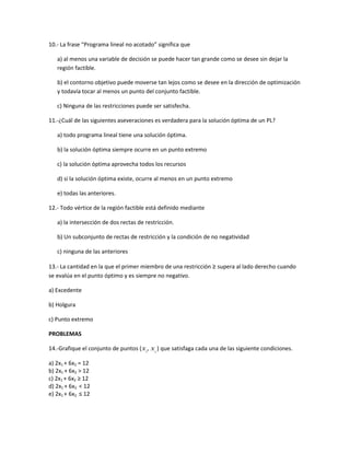 Este documento presenta una serie de preguntas de verdadero o falso y problemas sobre programación lineal. Las preguntas cubren conceptos clave como la región factible, solución óptima, restricciones activas, no acotación y factibilidad. Los problemas piden al estudiante graficar regiones factibles y soluciones óptimas usando el método gráfico para varios modelos de programación lineal.