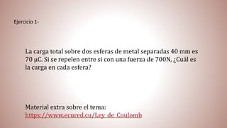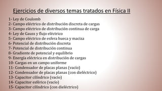 El documento presenta una serie de ejercicios sobre conceptos fundamentales de física eléctrica, incluyendo la ley de Coulomb, campos eléctricos, potenciales, energía eléctrica y capacitancia. Cada ejercicio incluye un enunciado específico y, en muchos casos, se proporciona material extra para profundizar en el tema tratado. Se abordan tanto distribuciones discretas como continuas de carga y se considera la resolución de problemas prácticos y teóricos en el contexto de estas leyes físicas.