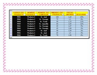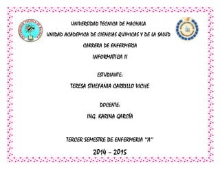 Este documento presenta una lista de ejercicios de Informatica II para estudiantes de Enfermería en la Universidad Técnica de Machala. Los ejercicios cubren funciones estadísticas como contar, máximo, mínimo y mediana, filtros en Excel, formato condicional, tablas dinámicas, gráficas estadísticas y macros. Los estudiantes aprenderán a usar estas herramientas para analizar y visualizar datos.