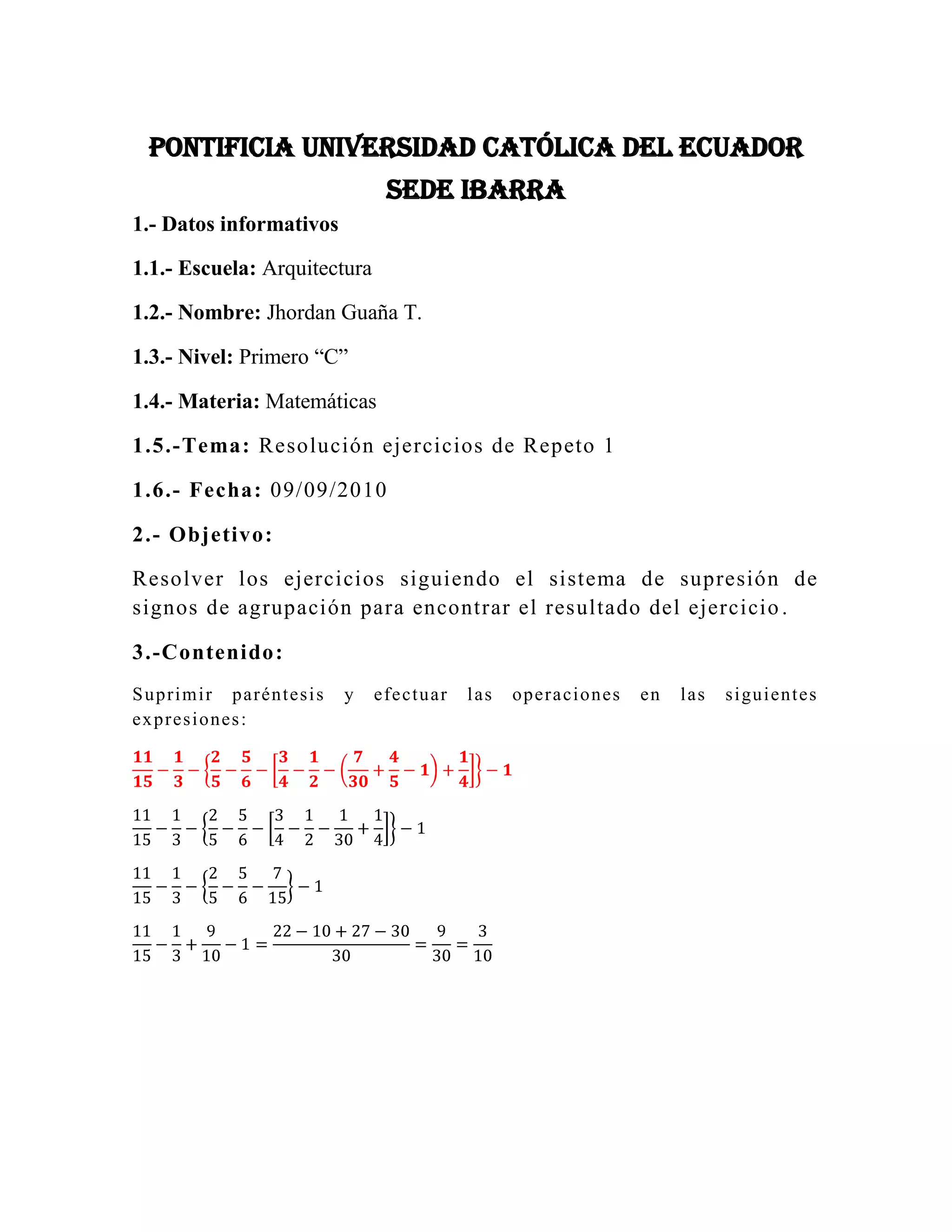 El documento presenta una serie de ejercicios matemáticos de álgebra que involucran la supresión de signos de agrupación y la realización de operaciones. Se piden resolver 18 ejercicios siguiendo estos pasos. Los ejercicios contienen expresiones algebraicas con sumas, restas, multiplicaciones y divisiones.
