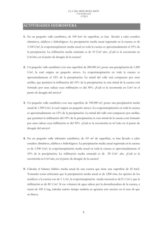 Este documento contiene 10 problemas relacionados con el cálculo del balance hídrico y la escorrentía en pequeñas cuencas hidrográficas cantábricas. Se proporcionan datos como la precipitación media anual, evapotranspiración y la infiltración para cada cuenca, y se piden cálculos como la escorrentía total anual, implicaciones de la sobreexplotación de recursos hídricos, y formas de reducir el riesgo de inundaciones.