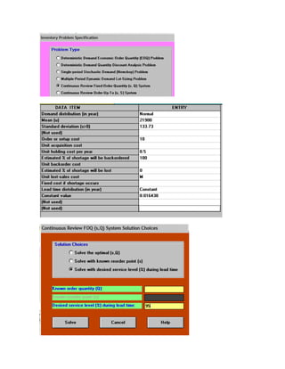 Este documento presenta diferentes modelos de inventarios. Explica el modelo de cantidad fija del pedido, donde se determina la cantidad óptima de pedido y el punto de reorden. También describe el modelo de cantidad fija con inventario de seguridad, donde se calcula el punto de reorden considerando la demanda promedio, desviación estándar y tiempo de entrega. Finalmente, introduce el modelo de periodo fijo, que revisa los inventarios en momentos predeterminados.