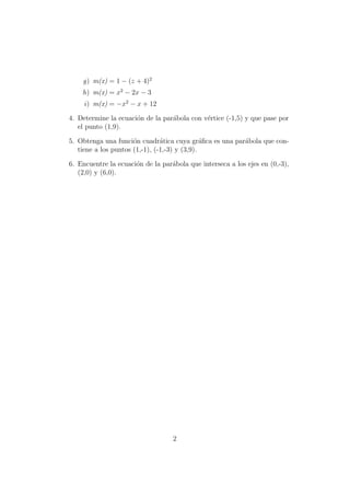 El documento presenta una serie de ejercicios relacionados con funciones lineales y cuadráticas. En el primer ejercicio se pide determinar la función lineal que satisface ciertas condiciones dadas sobre su pendiente y valores en puntos específicos. En el segundo ejercicio se pide determinar la ecuación de la recta que pasa por puntos dados. El tercer ejercicio trata sobre funciones cuadráticas y pide determinar sus puntos de intersección con los ejes, concavidad, crecimiento, eje de simetría y vért