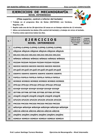 Este documento presenta una serie de ejercicios de mecanografía para desarrollar y mejorar la técnica de escritura en el teclado. Incluye tres niveles de ejercicios (básico, intermedio y avanzado) con 20 ejercicios cada uno, que deben repetirse 10 veces en un tiempo máximo. El objetivo es practicar diariamente ubicando correctamente los dedos y escribiendo sin mirar el teclado.