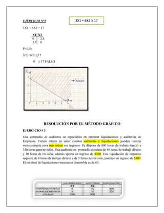 1) El documento presenta un ejercicio de programación lineal para maximizar los ingresos de una compañía de auditores que realiza auditorías y liquidaciones. 2) Se formulan las restricciones de recursos disponibles y se define la función objetivo de maximizar los ingresos. 3) Al resolver el modelo se obtiene que la solución óptima es realizar 40 liquidaciones y 12 auditorías para obtener un ingreso de $7,600.