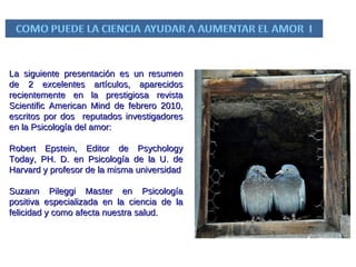 El documento presenta un resumen de dos artículos sobre la psicología del amor. Describe habilidades importantes para parejas duraderas como la resolución de conflictos y la comunicación. Identifica 11 factores que contribuyen al amor, especialmente el compromiso y la comunicación. Finalmente, propone varios ejercicios probados científicamente para aumentar el afecto entre parejas, como abrazarse, mirarse a los ojos y sincronizar la respiración.