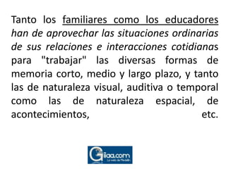 El documento propone ejercicios prácticos para mejorar la memoria de niños y jóvenes mediante actividades cotidianas y juegos. Se sugiere aprovechar interacciones ordinarias, como ayudar en la casa o en la escuela, para fortalecer diferentes tipos de memoria. Además, se menciona la importancia de complementar estas actividades con entrenamientos más técnicos para maximizar los beneficios cognitivos.