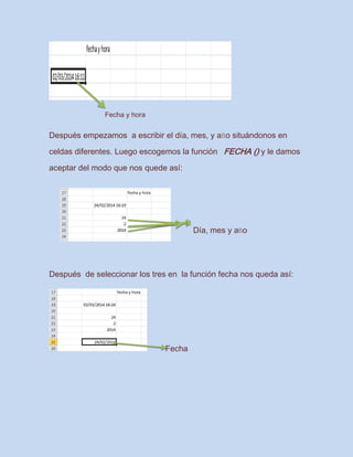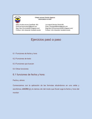 Este documento presenta varias funciones de Excel, incluyendo funciones de fecha y hora, funciones de texto, funciones de búsqueda y otras funciones estadísticas. Se explican funciones como AHORA(), FECHA(), DIAS360() para calcular edades, CONCATENAR() para concatenar cadenas, y BUSCAR() para buscar valores. También cubre funciones matemáticas como PRODUCTO() y de conversión a números romanos NUMERO.ROMANO(), así como funciones estadísticas como PROMEDIO() y MEDIANA().