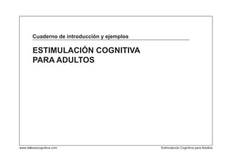 Este documento presenta ejemplos de ejercicios de estimulación cognitiva para adultos de diferentes áreas como la atención, funciones ejecutivas, lenguaje, memoria, percepción, lectoescritura y visoconstrucción. Explica que los ejercicios están fundamentados en modelos clínicos y teóricos actuales y que hay diferentes niveles de dificultad. Muestra algunos ejemplos breves de ejercicios de atención, funciones ejecutivas y lenguaje.