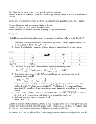 Este documento describe los conceptos fundamentales de pH y cómo calcular el pH de soluciones de ácidos fuertes y débiles. Explica que el pH es el logaritmo negativo de la concentración de iones hidrógeno y cómo para ácidos fuertes como HCl, la concentración de H+ es igual a la concentración del ácido. Para ácidos débiles, se usa la constante de acidéz Ka y tablas de variaciones molares para determinar las concentraciones de especies e igualar la ecuación de Ka para calcular el pH.