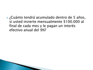 El documento presenta varios problemas de finanzas personales y corporativas que involucran cálculos de intereses compuestos, tasas efectivas y nominales, valor presente, planes de ahorro e inversiones. Los problemas buscan calcular montos a invertir, ahorrar o pagar para alcanzar ciertos objetivos financieros en el corto y mediano plazo.