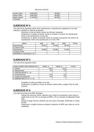 El documento presenta una serie de ejercicios de Excel relacionados con hojas de cálculo y gráficos. Los ejercicios incluyen tareas como mostrar datos de ventas por vendedor y trimestre, calcular precios con IVA, crear informes de sueldos y comisiones, y generar gráficos de barras y sectores para comparar datos. El documento proporciona los datos de entrada necesarios y las instrucciones para completar cada ejercicio.