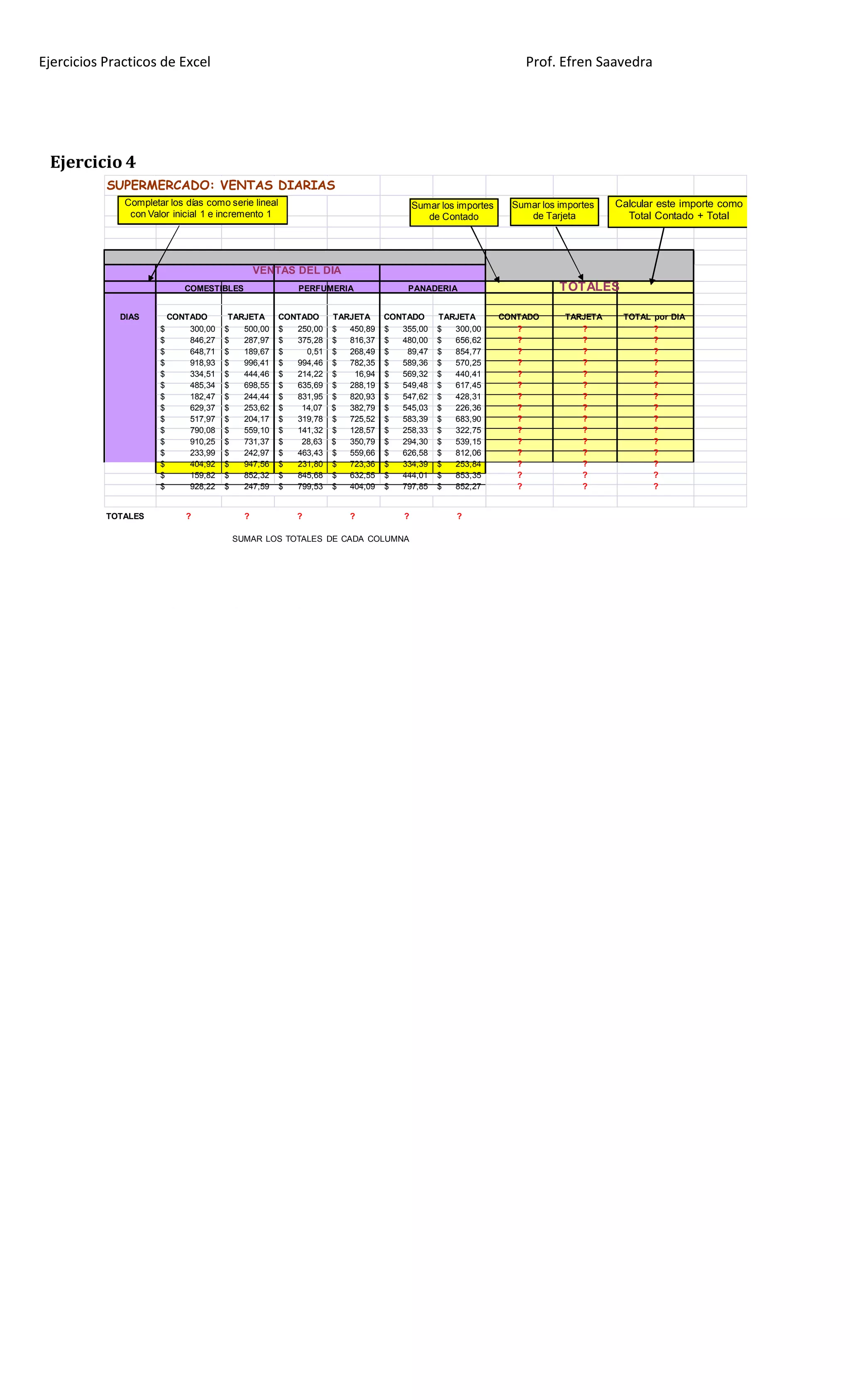 Este documento presenta 15 ejercicios prácticos de Excel. Los ejercicios cubren temas como el uso de fórmulas, formatos, gráficos condicionales y tablas. El objetivo es que los estudiantes practiquen y mejoren sus habilidades básicas en Excel resolviendo cada uno de los ejercicios planteados.