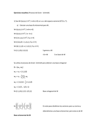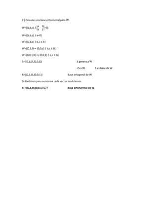 El documento explica cómo aplicar el proceso de Gram-Schmidt para obtener una base ortonormal de dos subespacios vectoriales W del espacio R3. En el primer ejemplo, W={(a,b,c) ∈ R3 / a+b+c=0} y la base ortonormal resultante es B={(-1,1,0),(-1/2,-1/2,1)}. En el segundo ejemplo, W={(a,b,c) / a=0} y la base ortonormal es B'={(0,1,0),(0,0,1)}. Se pro