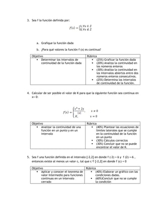 Este documento presenta 15 problemas relacionados con la continuidad y derivabilidad de funciones. Los problemas cubren temas como la definición de continuidad, cálculo de límites, derivadas, ecuaciones de rectas tangentes, funciones compuestas y propiedades de funciones.