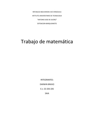 Este documento presenta un trabajo de matemática realizado por Darwin Bravo, estudiante del Instituto Universitario de Tecnología "Antonio José de Sucrez" en Barquisimeto, Venezuela.