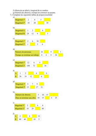 Este documento presenta una serie de ejercicios sobre magnitudes proporcionales y porcentajes para estudiantes de primer año de secundaria. Los ejercicios incluyen calcular razones entre cantidades, determinar si pares de razones forman proporciones, completar tablas de proporcionalidad, resolver problemas utilizando la regla de tres, y calcular porcentajes expresados como razones y números decimales. El documento proporciona 16 ejercicios para que los estudiantes practiquen y apliquen conceptos básicos de proporcionalidad