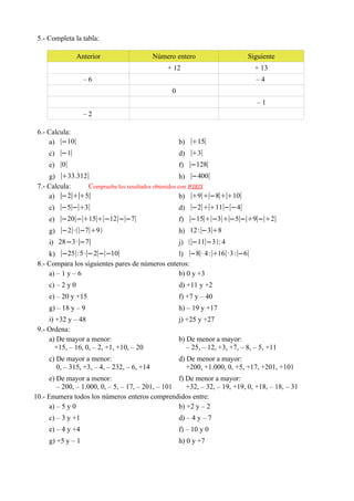 Este documento contiene 23 ejercicios de números enteros propuestos para estudiantes de primer año de la ESO. Los ejercicios cubren temas como expresar cantidades en la vida real con números enteros, determinar el significado de números enteros en diferentes contextos, representar números enteros en una recta numérica, realizar operaciones básicas como suma, resta, multiplicación y división con números enteros, calcular valores absolutos, y determinar números enteros desconocidos a través de operaciones.