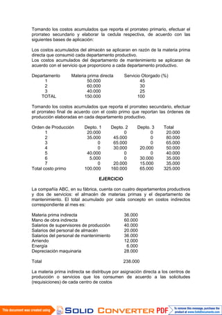 La compañía Maderas S.A. tiene tres departamentos productivos y dos de servicios que incurren en costos indirectos mensuales totales de $73,260. Estos costos se distribuyen a los departamentos mediante un proceso de prorrateo primario, secundario y final según diferentes bases como consumo de materia prima, superficie ocupada, y producción por orden. El documento proporciona detalles sobre cada etapa del proceso de prorrateo.