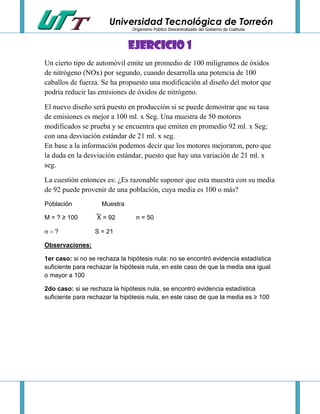 Este documento presenta nueve ejercicios de pruebas de hipótesis realizados por un estudiante. Cada ejercicio describe un escenario o experimento, proporciona datos de muestras como el promedio, desviación estándar y tamaño de muestra, y guía al estudiante a través del proceso de realizar una prueba de hipótesis para determinar si los resultados apoyan o rechazan la hipótesis nula planteada.