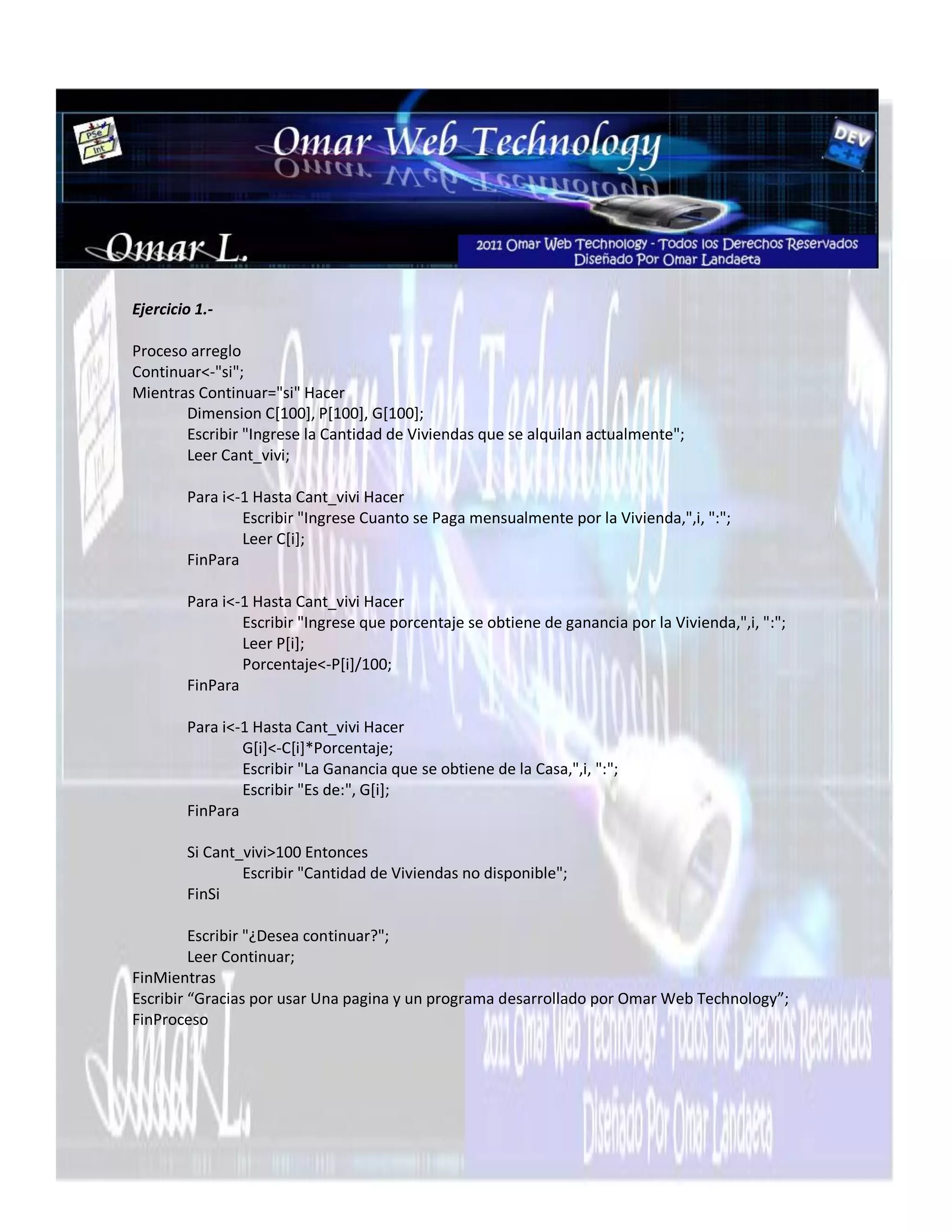 Este documento contiene 10 ejercicios de programación en Pseudocódigo. Cada ejercicio presenta un problema diferente como calcular áreas, sueldos, vectores o ecuaciones de segundo grado. Los ejercicios utilizan estructuras de control como si/sino, mientras, para y seleccionar para resolver los problemas de manera lógica y algorítmica.