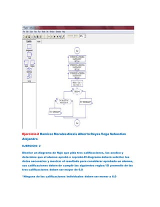 El documento presenta 6 ejercicios para diseñar diagramas de flujo para resolver diferentes problemas matemáticos y de lógica. El primer ejercicio pide crear un diagrama para calcular el área de un rectángulo. El segundo solicita uno para determinar si un alumno aprobó o reprobó basado en 3 calificaciones. El tercero pide comparar el área y precio de 2 pizzas diferentes. Los ejercicios 4 y 5 piden crear diagramas para calcular el área de varios o n rectángulos respectivamente. Y el se