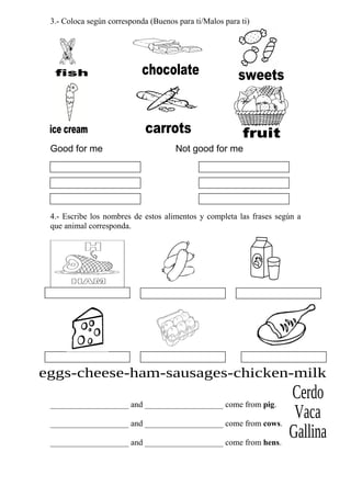 El documento proporciona instrucciones para completar una serie de ejercicios relacionados con alimentos. Los estudiantes deben nombrar y clasificar diferentes tipos de frutas y verduras, identificar qué alimentos son buenos o malos para la salud, y emparejar dibujos con frases que describen acciones relacionadas con las comidas.