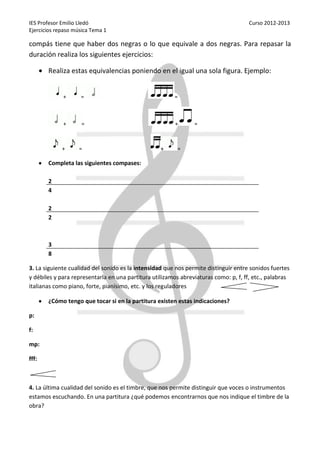 Este documento presenta ejercicios para repasar las cuatro cualidades del sonido - altura, duración, intensidad y timbre - que los estudiantes han estudiado previamente. Incluye ejercicios para practicar la representación de la altura y la duración en el pentagrama y en los compases, así como indicaciones sobre cómo representar e interpretar diferentes niveles de intensidad en una partitura musical.