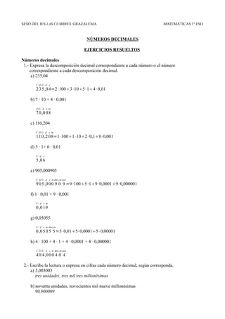 Este documento presenta ejercicios resueltos sobre números decimales. Incluye conversiones entre expresiones decimales y su lectura, determinación de unidades, décimas, centésimas y milésimas, comparación y ordenación de números decimales, y representación en la recta numérica. Los ejercicios cubren conceptos básicos de números decimales como adición, sustracción y comparación de valores decimales.