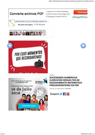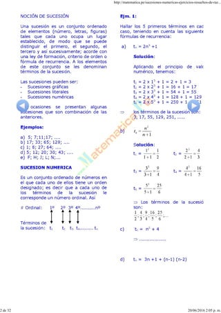 Este documento contiene información sobre sucesiones numéricas, incluyendo definiciones de sucesiones aritméticas, geométricas y polinómicas. Explica cómo calcular el término genérico de cada tipo de sucesión y resuelve varios ejercicios como ejemplos.